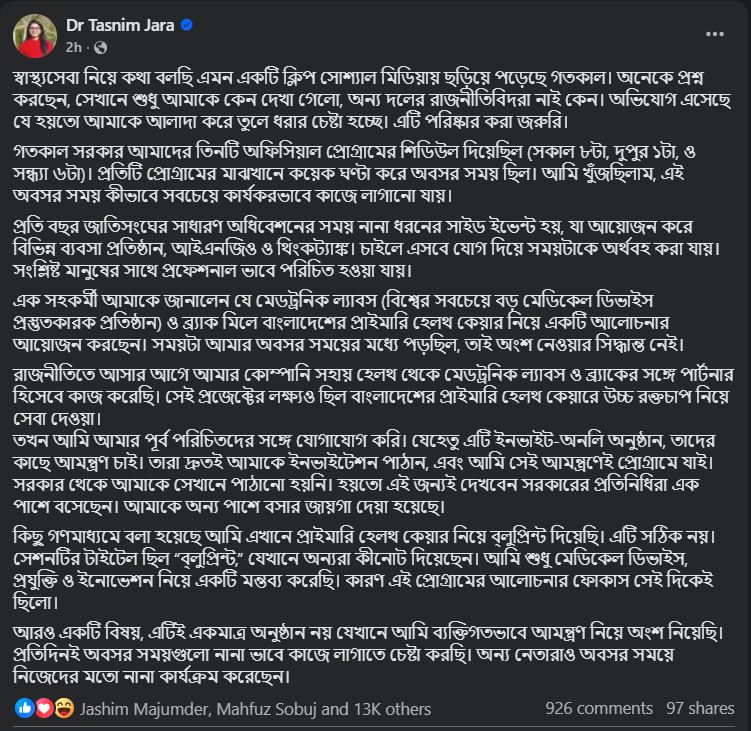 জাতিসংঘের সাধারণ অধিবেশনের ফাঁকে স্বাস্থ্যসেবা নিয়ে এনসিপি নেত্রী ডা. তাসনিম জারার বক্তব্য দেওয়ায় একটি ভিডিও সামাজিক যোগাযোগ মাধ্যমে ছড়িয়ে পড়েছে। বিষয়টি নিয়ে বেশ আলোচনা-সমালোচনার জন্ম দেওয়ায় এর ব্যাখ্যা দিয়েছেন এনসিপি নেত্রী।