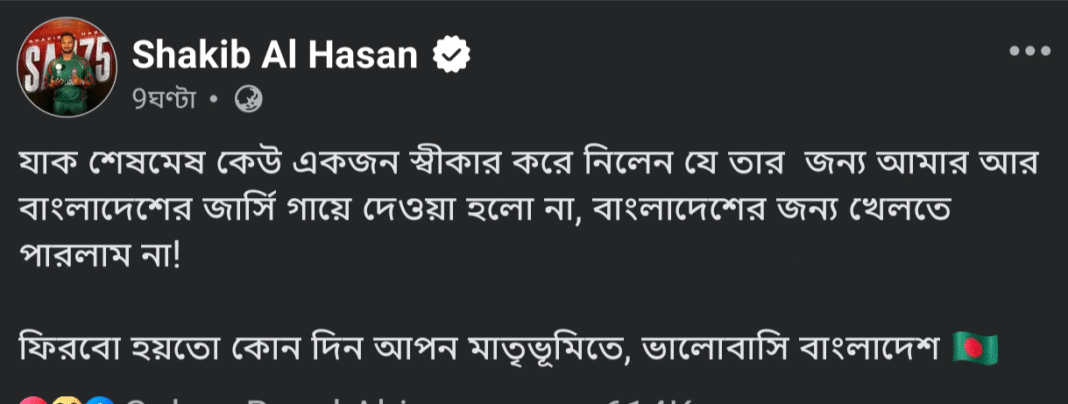 নিজের ভেরিফায়েড ফেসবুক পেইজে এক পোস্টে সাকিব লিখেছেন, যাক শেষমেষ কেউ একজন স্বীকার করে নিলেন যে তার জন্য আমার আর বাংলাদেশের জার্সি গায়ে দেওয়া হলো না, বাংলাদেশের জন্য খেলতে পারলাম না। ফিরবো হয়তো কোন দিন আপন মাতৃভূমিতে, ভালোবাসি বাংলাদেশ।